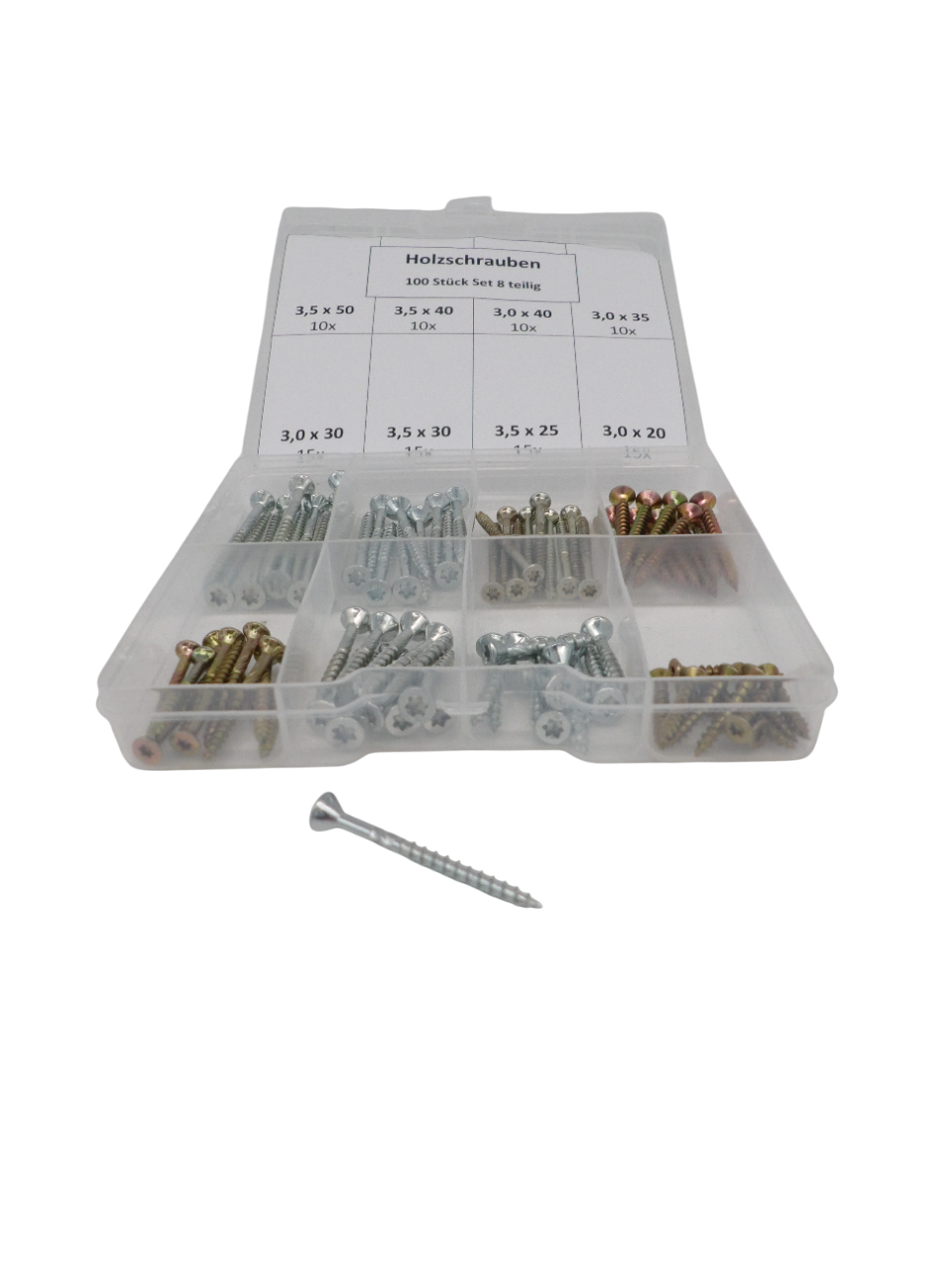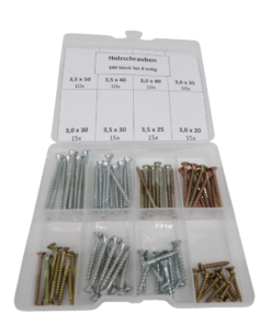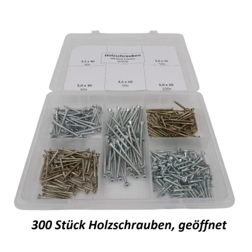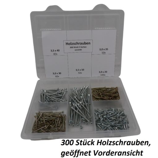 Sie erhalten ein 300-teiliges Holzschraubenset mit fünf verschiedenen Schraubengrößen. Dank der mitgelieferten Sortierbox bleibt jede Schraube in ihrem Fach. Die Schrauben sind verzinkt und besitzen ein Teilgewinde.