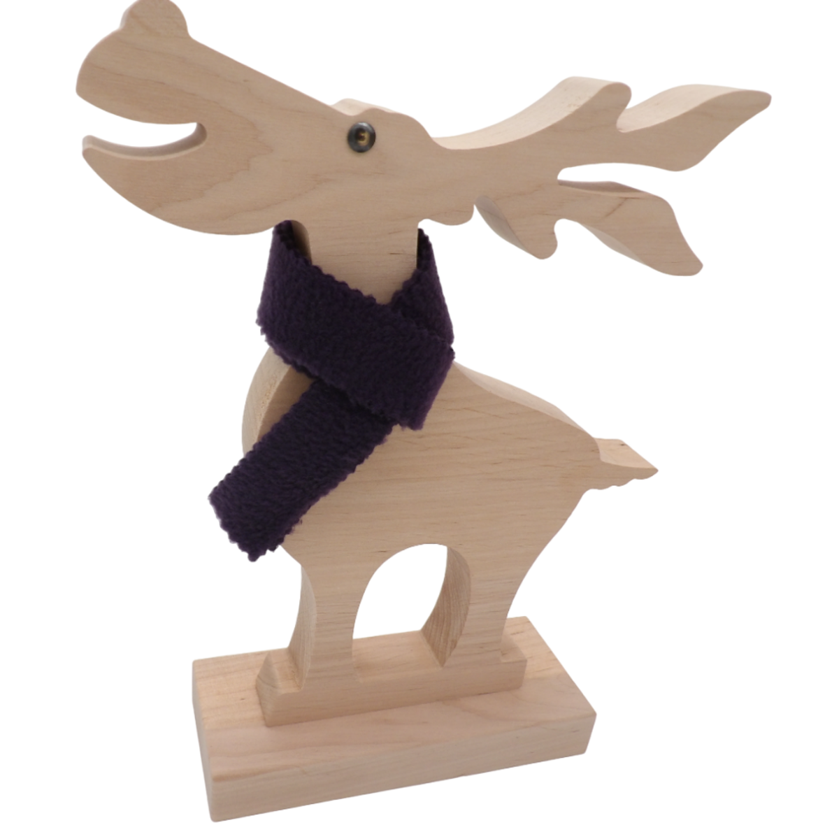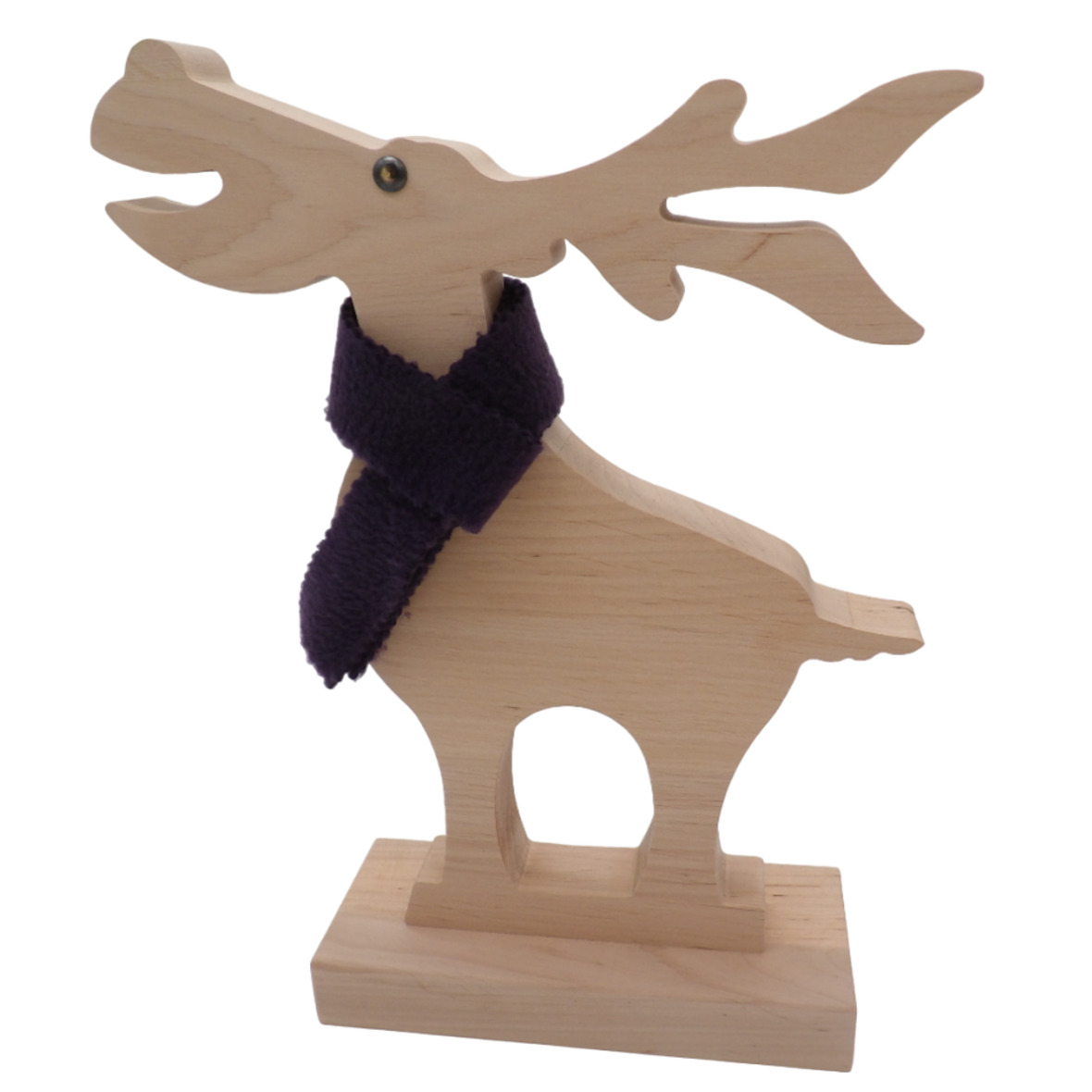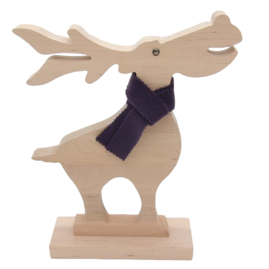 Ein schöner, handgearbeiteter Deko-Elch aus Holz mit fröhlichem Gesicht und einem Wollschal um den Hals.
