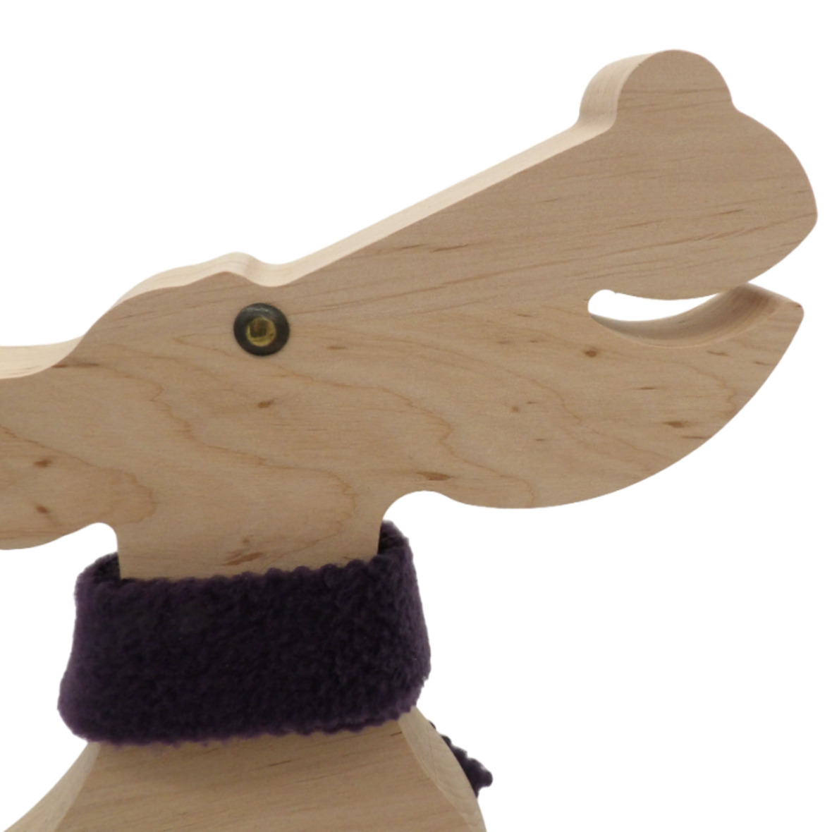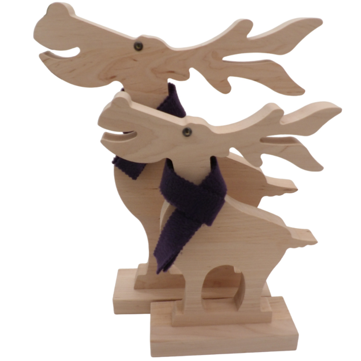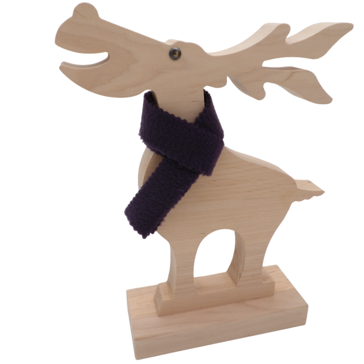 Ein schöner, handgearbeiteter Deko-Elch aus Holz mit fröhlichem Gesicht und einem Wollschal um den Hals.