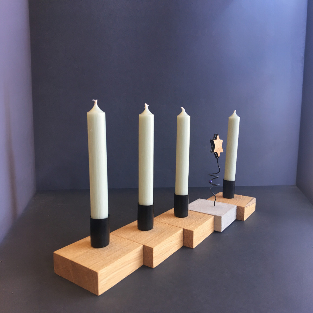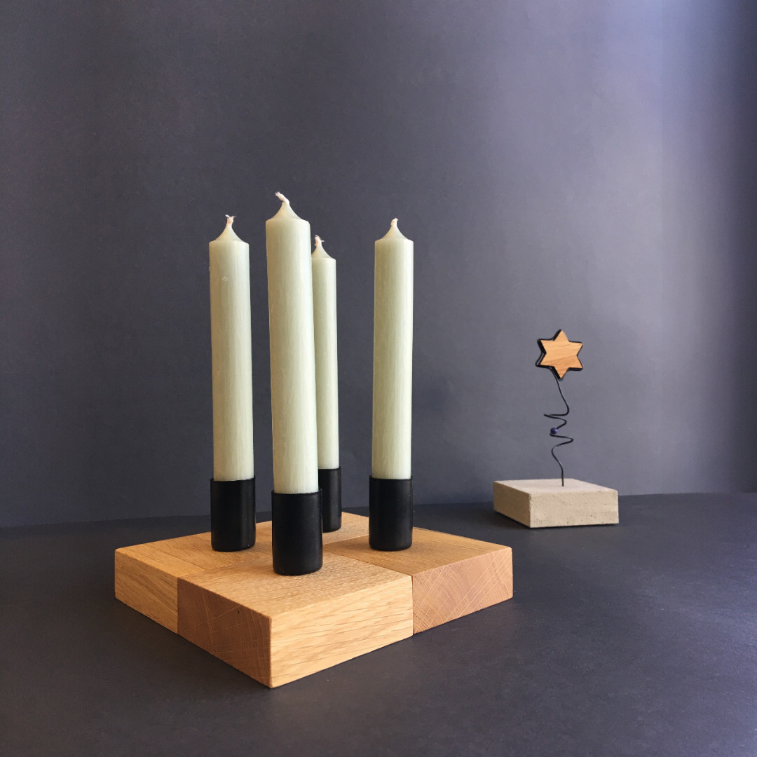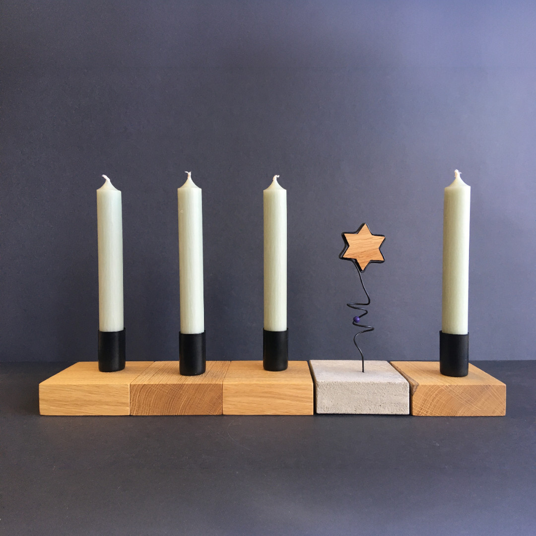 Das 5-teilige Set besteht aus vier hochwertigen Kerzenhaltern aus Eichenholz und einem mittigen Betonelement mit filigranem Holzstern – eine stilvolle Kombination, die jedes Zuhause bereichert.